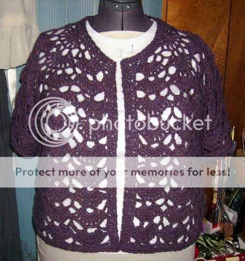 Anyhoo, I worked up the jacket with the Berocco Ultra Alpaca in the "Prune Mix" colorway. Some of you may remember it from here. I frogged that sweater and reused the yarn. No since in wasting good yarn on such an ill fitted garment. Besides, I'm not a Rockefeller and yarn AIN'T cheap. As usual I made my usual adjustments and cut the arms down to make them short sleeve. I also omitted the butterfly clasp because women with big tiggly biddys (read: breasts) shouldn't wear jackets/tops with single closures at the neck. It's obscene! I really like the Amazing Crochet Lace book. I did notice though that the pattern did have a number of small errors in it. But once you learned the actual pattern repeat you really didn't need to look at the book again save for increasing points. I also didn't like that the charts on this pattern were blurry, small, and not complete. This of course will not hinder me from doing other garments out of the book.
